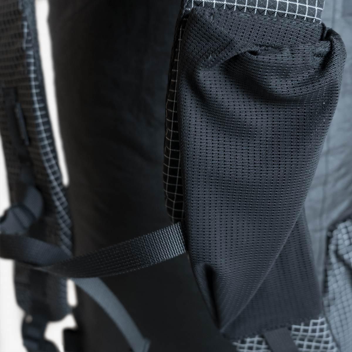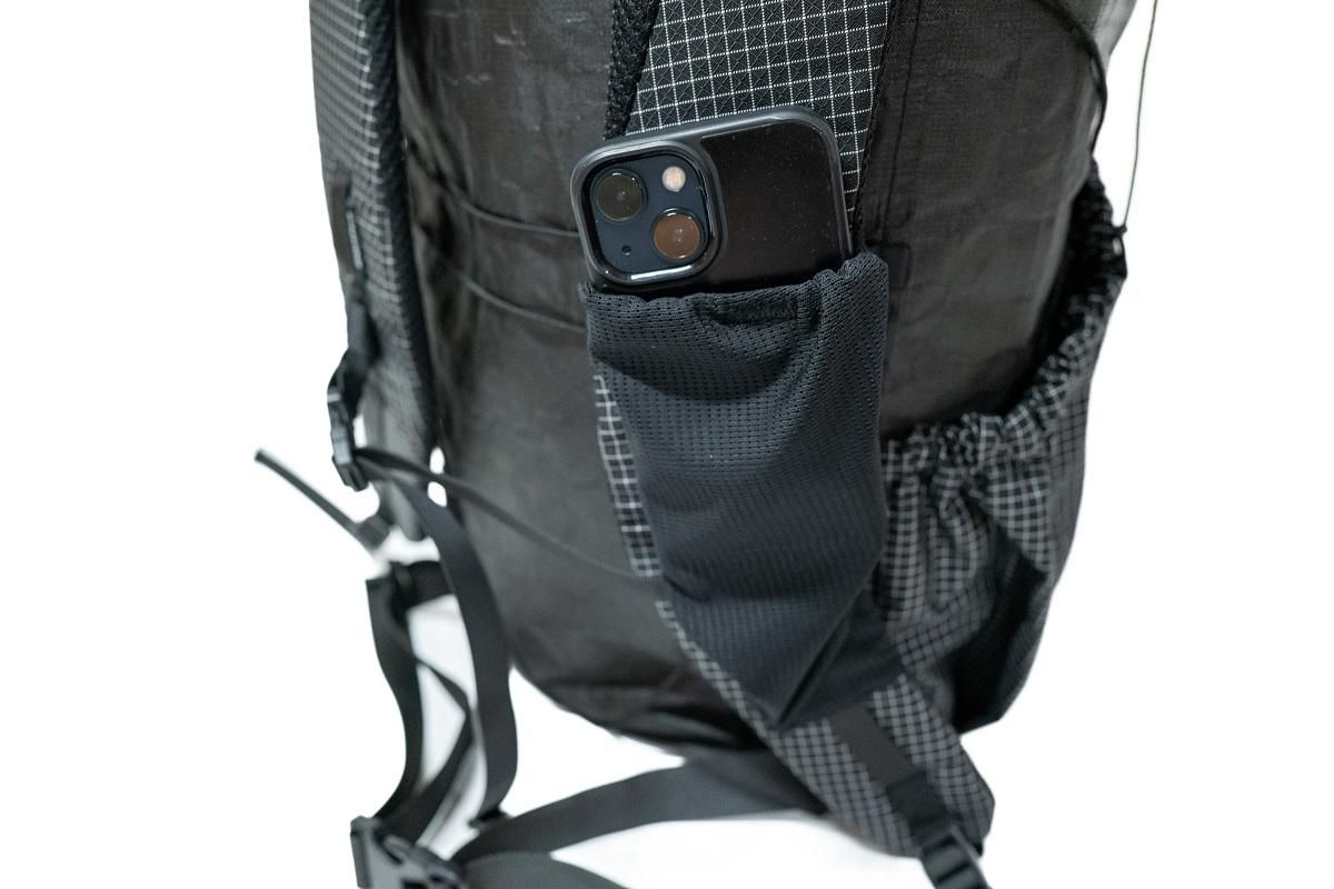 左側のショルダーハーネスにはストレッチ性の高いメッシュ生地のポケットが取り付けてあり、行動食やスマートフォンを入れるのに最適です。ボトムにもポケットが配置されています。(取り出し口は右側)