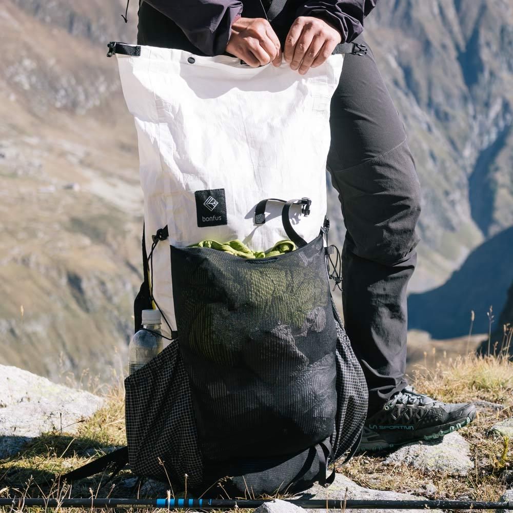 Iterus38Lはフレームレスパックで、最先端の防水素材を使用し、非常に軽量で耐久性のあるパックを実現しています。