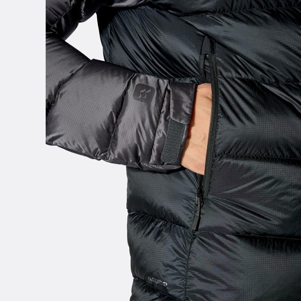 800フィルパワーのヨーロピアングースダウンを使用し、軽量ながら圧倒的な保温力を発揮。濡れにも強いGrangers社の撥水加工ダウンを採用しているため、降雪や結露といった湿気の多い環境下でもロフトを維持します。