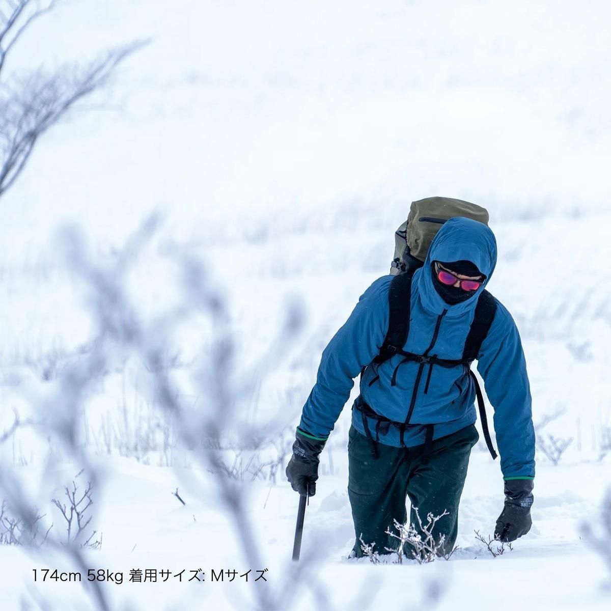 - ヘルメットやニットキャップと重なるフード上部、バックパックのハーネスと重なる腰回り、グローブと重なる袖口周りはOcta®CPCP®を抜いてナイロンシェル地のみ